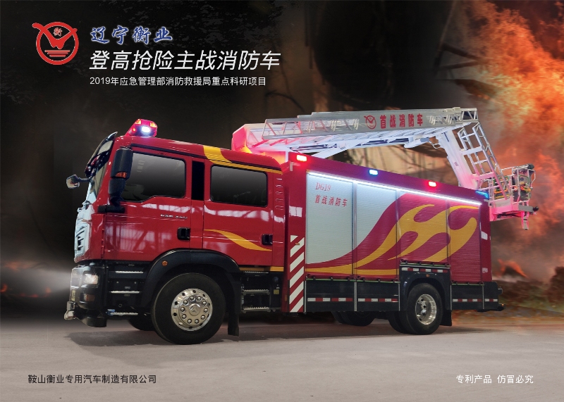 登高搶險主戰消防車是2019年應急管理部消防救援局重點科研項目產品。車輛底盤為汕德卡ZZ5206N471GF5底盤,發動機型號MC07H.35-60,功率:257kw,國六排放標準,軸距:4700mm,容量:水3000kg,泡沫1000kg,罐體材質:耐低溫高分子化合物PP材質,消防泵為美國大力,型號為KSP1000;流量:60L/s;消防炮為美國阿密龍,型號為3482+5177,照明系統:發電機功率為5.5Kw;牽引絞盤系統:杭州天銘,型號為FEW16500;液壓工作臂由三節臂架組成,其中有兩節伸縮和一節小臂。工作平臺載荷270公斤,平臺額定工作高度19米。