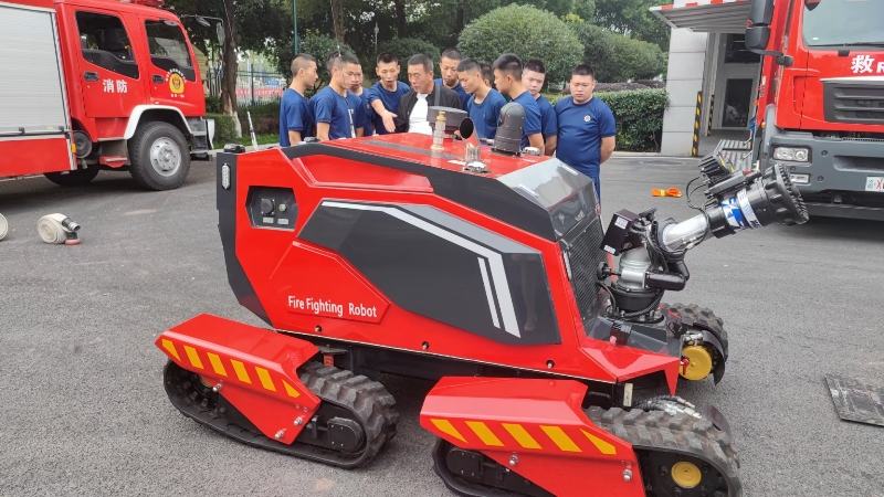 在演示活動上,我公司自主研發的全地形消防滅火機器人,通過全程智能化遙控操作,可以更好的完成現場救災滅火任務。四履帶獨立驅動,可以全地形移動,360度原地調頭,同時還可以實現高空出水等諸多高難度動作,具有靈活、高效、安全的特點。