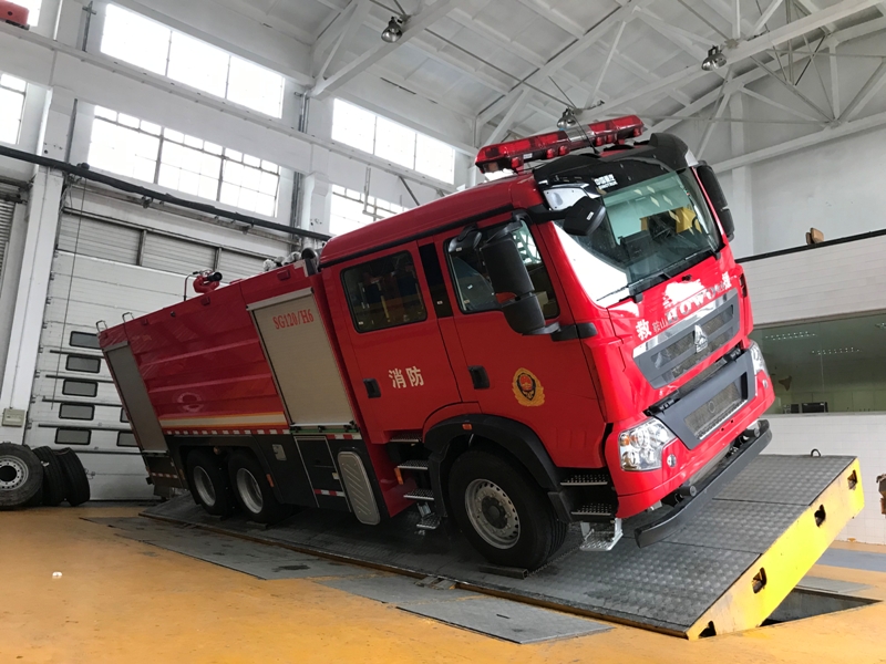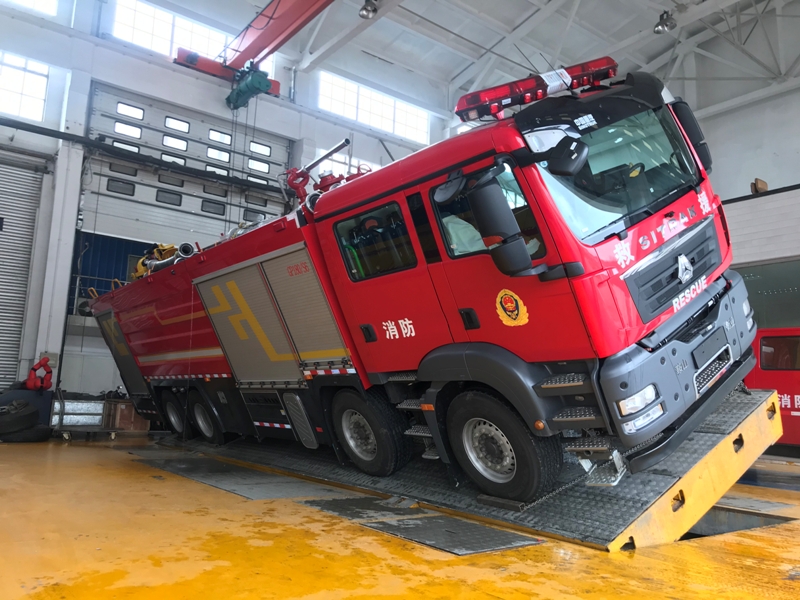 車輛底盤為ZZ5207TXFV471GF5底盤,發動機型號MC07H.35-60,功率為257kw,國六排放標準,軸距4500mm,罐體材質采用采用優質304不銹鋼板,容罐容量:水3600kg+B類泡沫900kg+A類泡沫200kg;消防泵為KSP1000(美國大力);壓縮空氣泡沫系統:品牌:美國大力,型號:KSPBC1000/220型,型式:全自動集成式壓縮空氣A類泡沫系統,消防炮為PLKD48手動及電控,升降照明系統YZH6-4.83CFA,牽引絞盤系統為杭州天銘FHW16500 整車器材箱卷簾門防水槽采用專用鋁合金開模型材,型材上加裝LED照明燈帶,使整車形成環繞式照明,既美觀且照明效果又好。器材箱卷簾門下部翻轉踏板,采用一體式鋁合金擠壓型材,模塊化組裝,增加了整車的品質。箱體內部器材框架采取了專用的的擋板型材,有效的保證了內部器材固定的穩定性,同時使器材標牌整齊化一,清晰明了。壓縮空氣系統采用美國大力集成式系統,結構緊湊、性能優良、操作簡便統一空間利用率高??諌簷C流量為國內目前CAFS系統中最大流量,可達105L/S,更好地滿足于壓縮空氣泡沫系統性能需求。